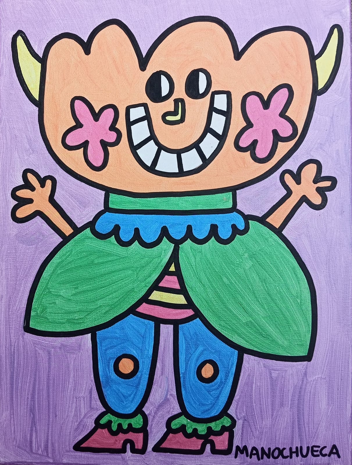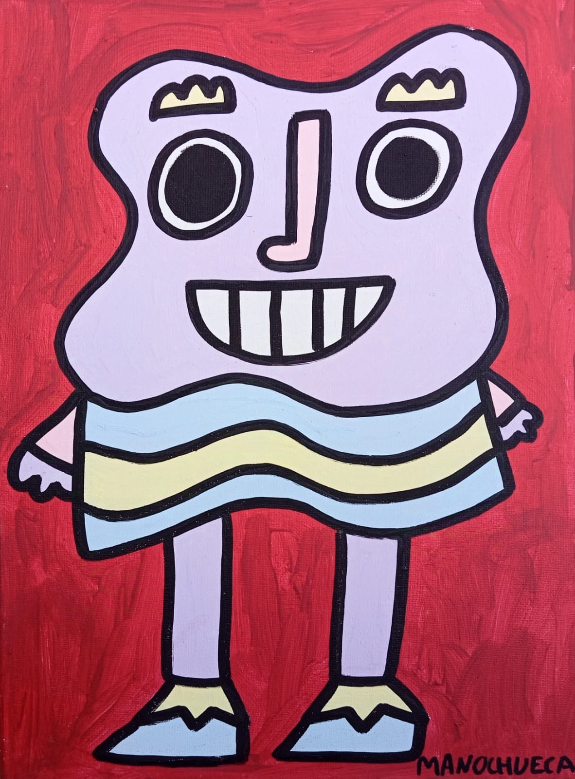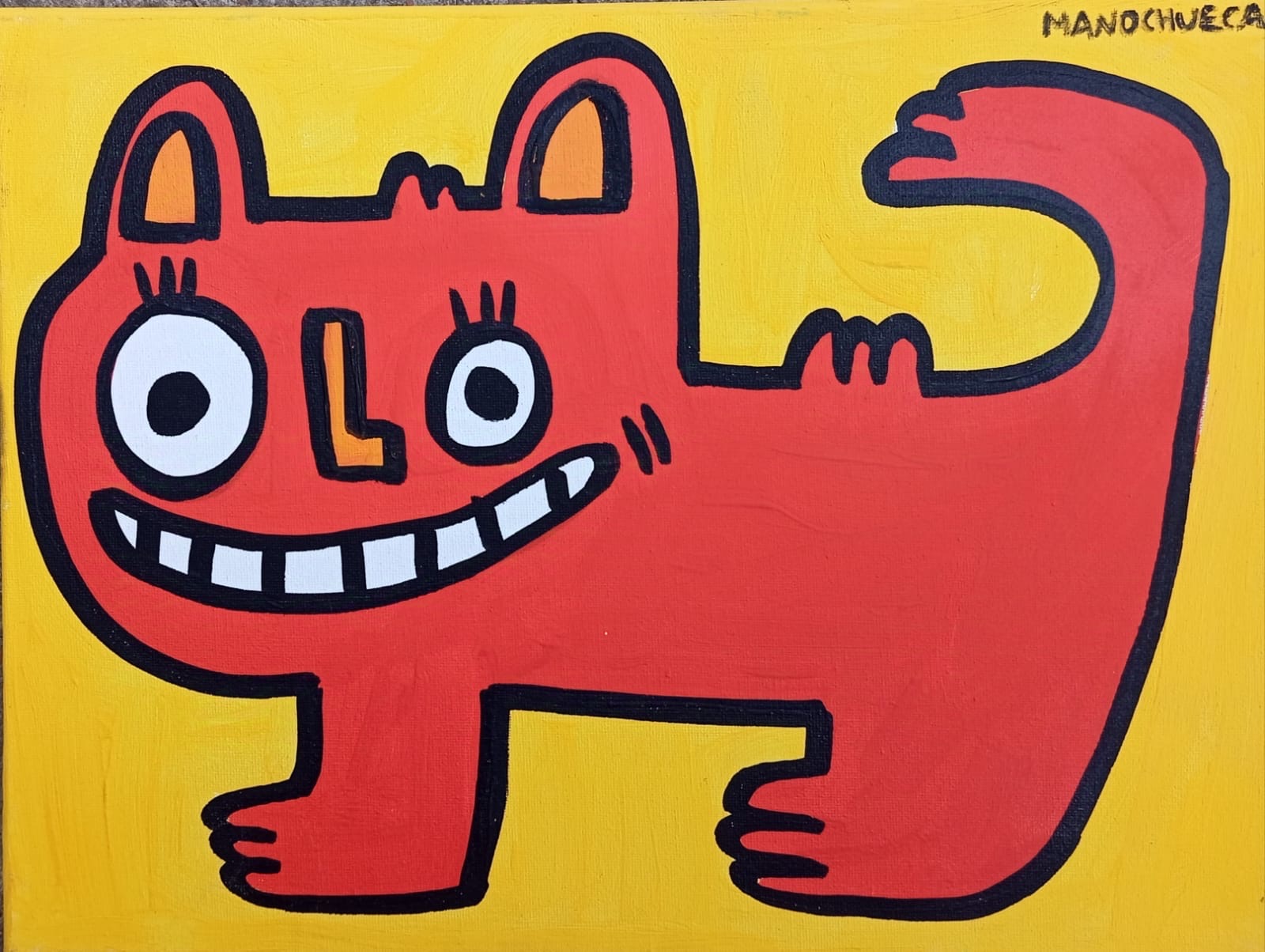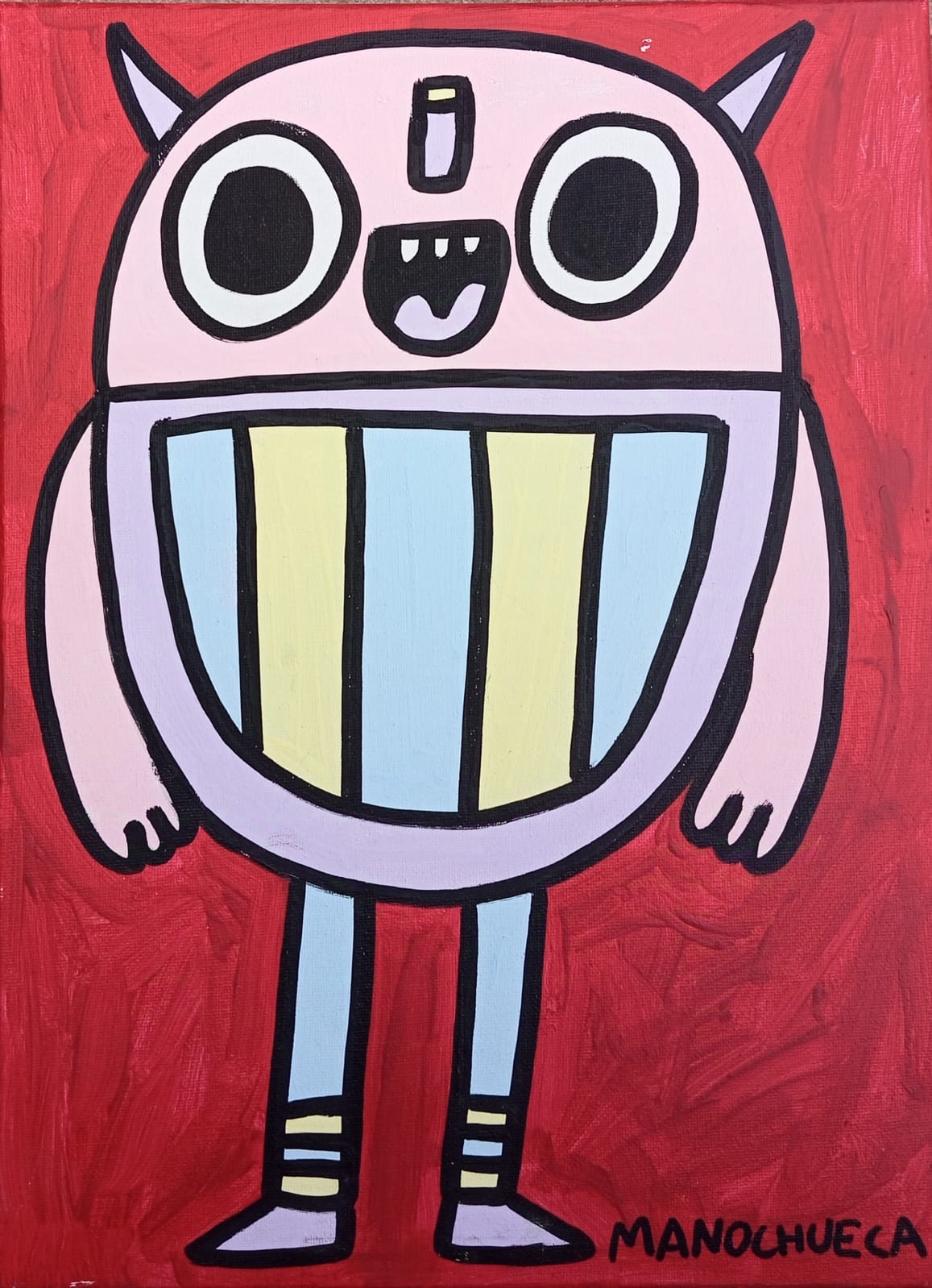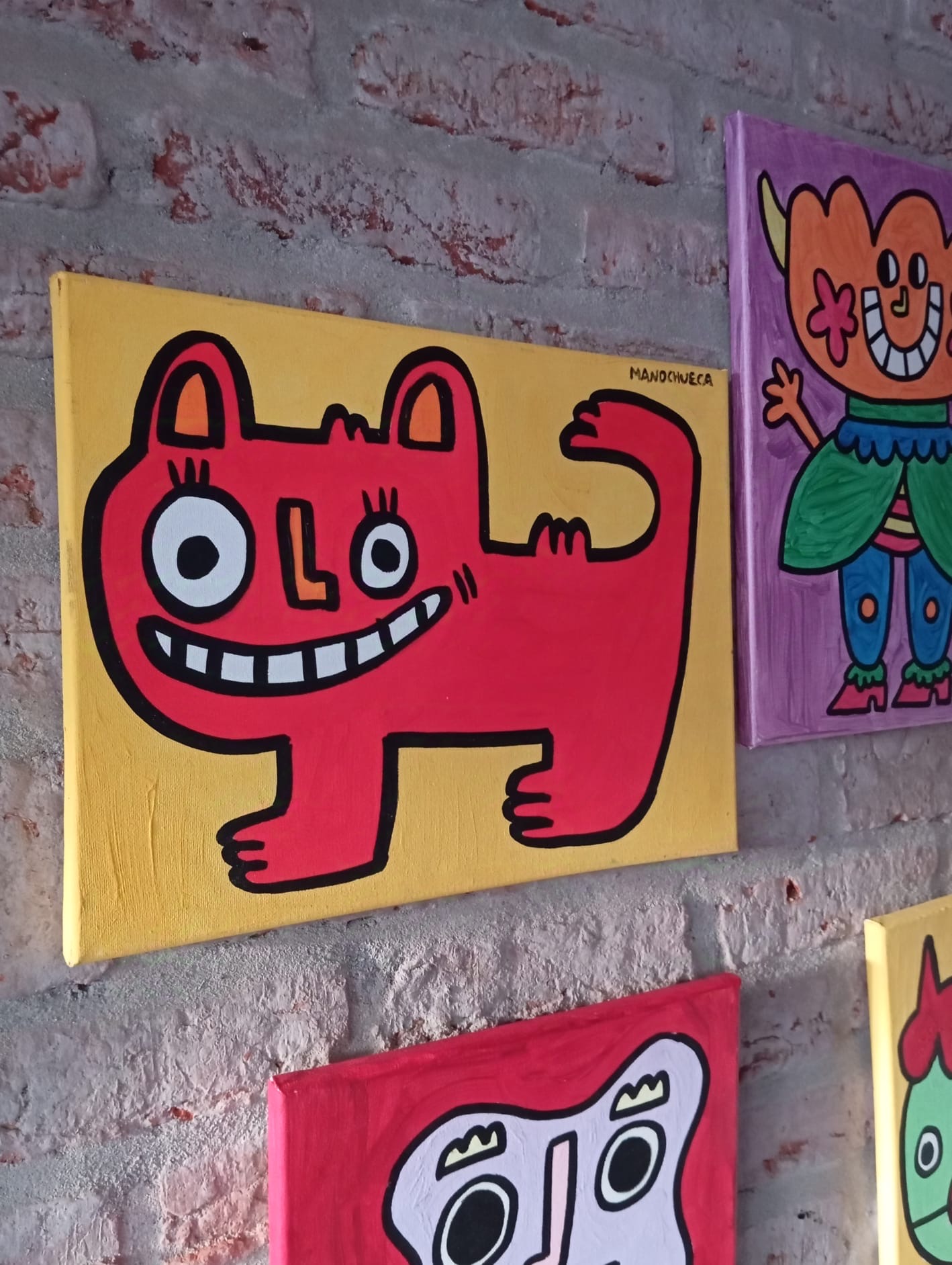 Con líneas gruesas y colores intensos, las criaturas de Manochueca parecen personajes escapados de los dibujos animados, pero con una libertad y frescura que nos recuerda el espíritu de Keith Haring