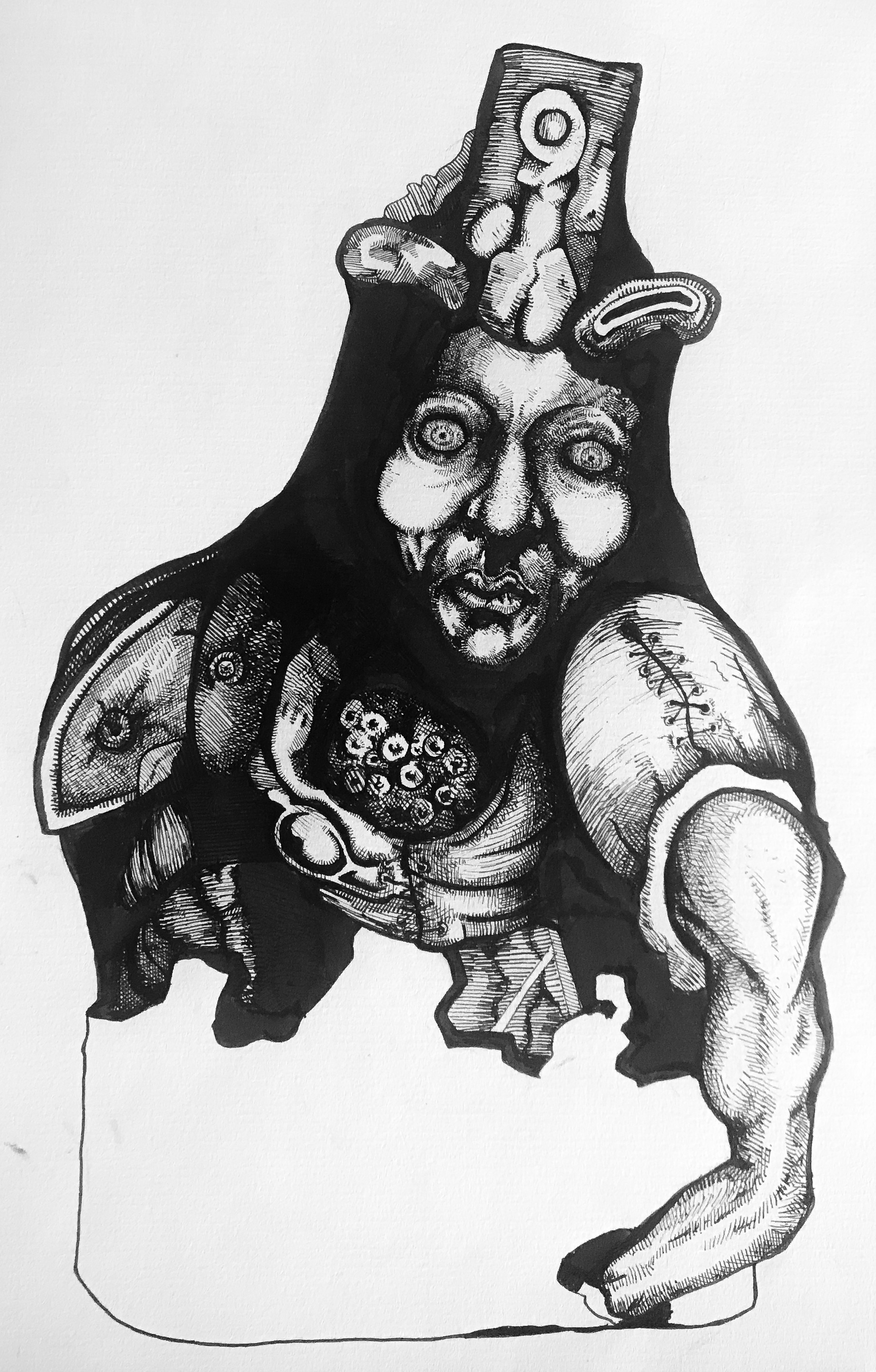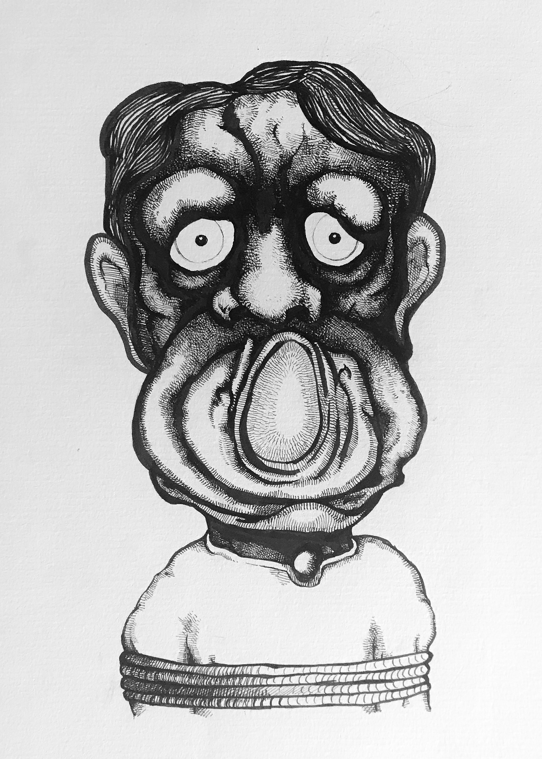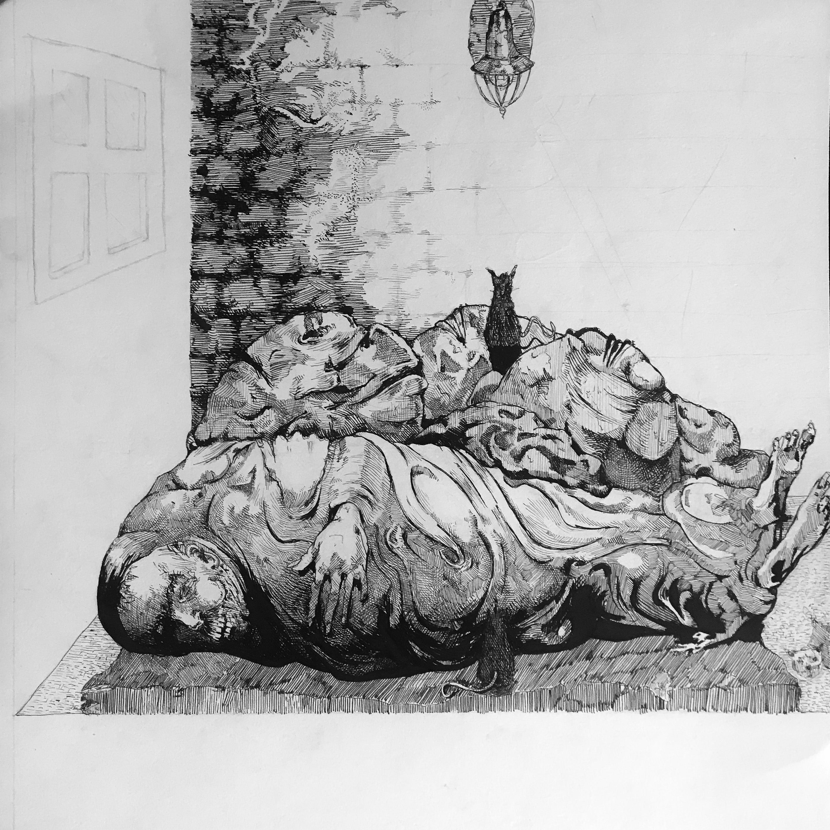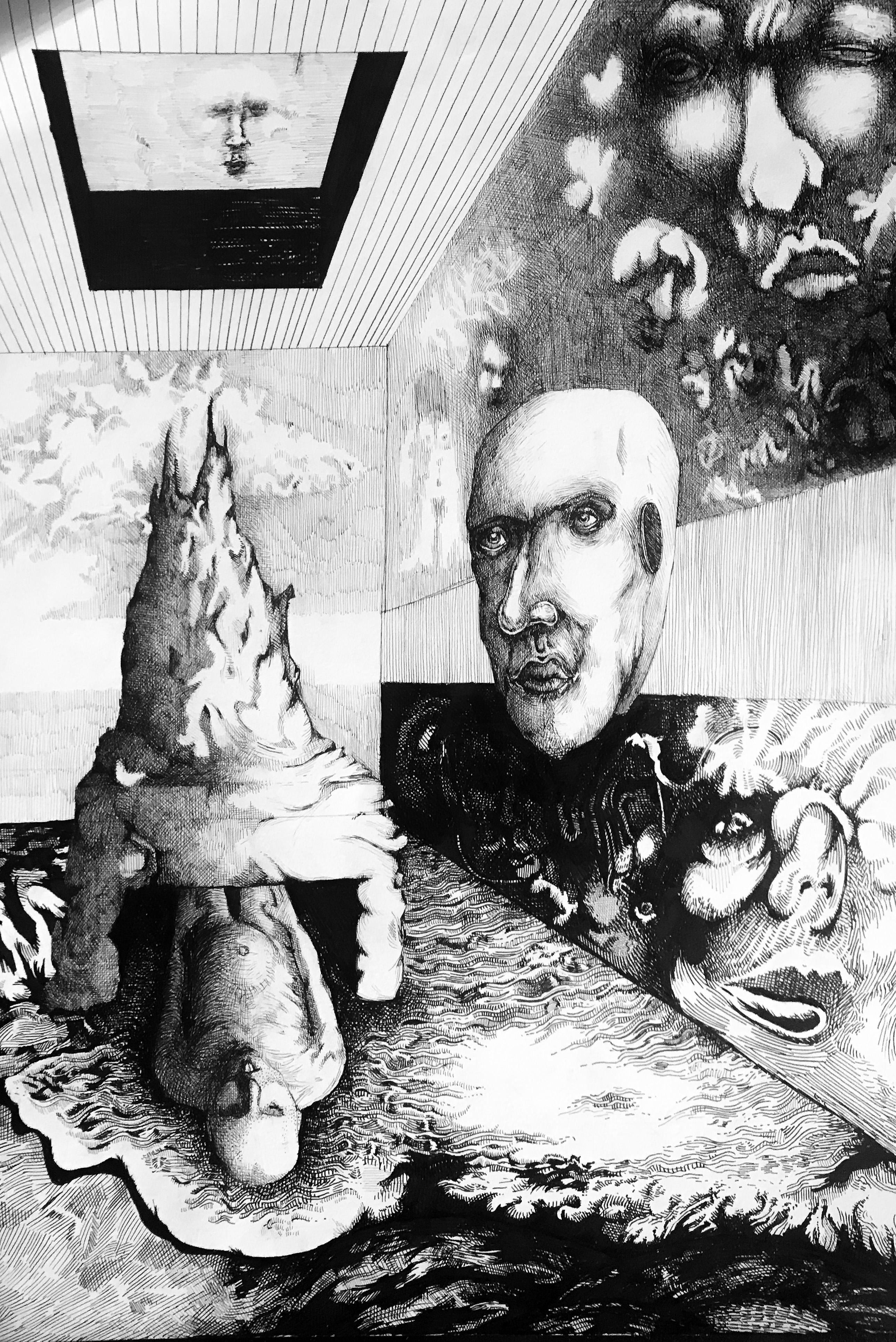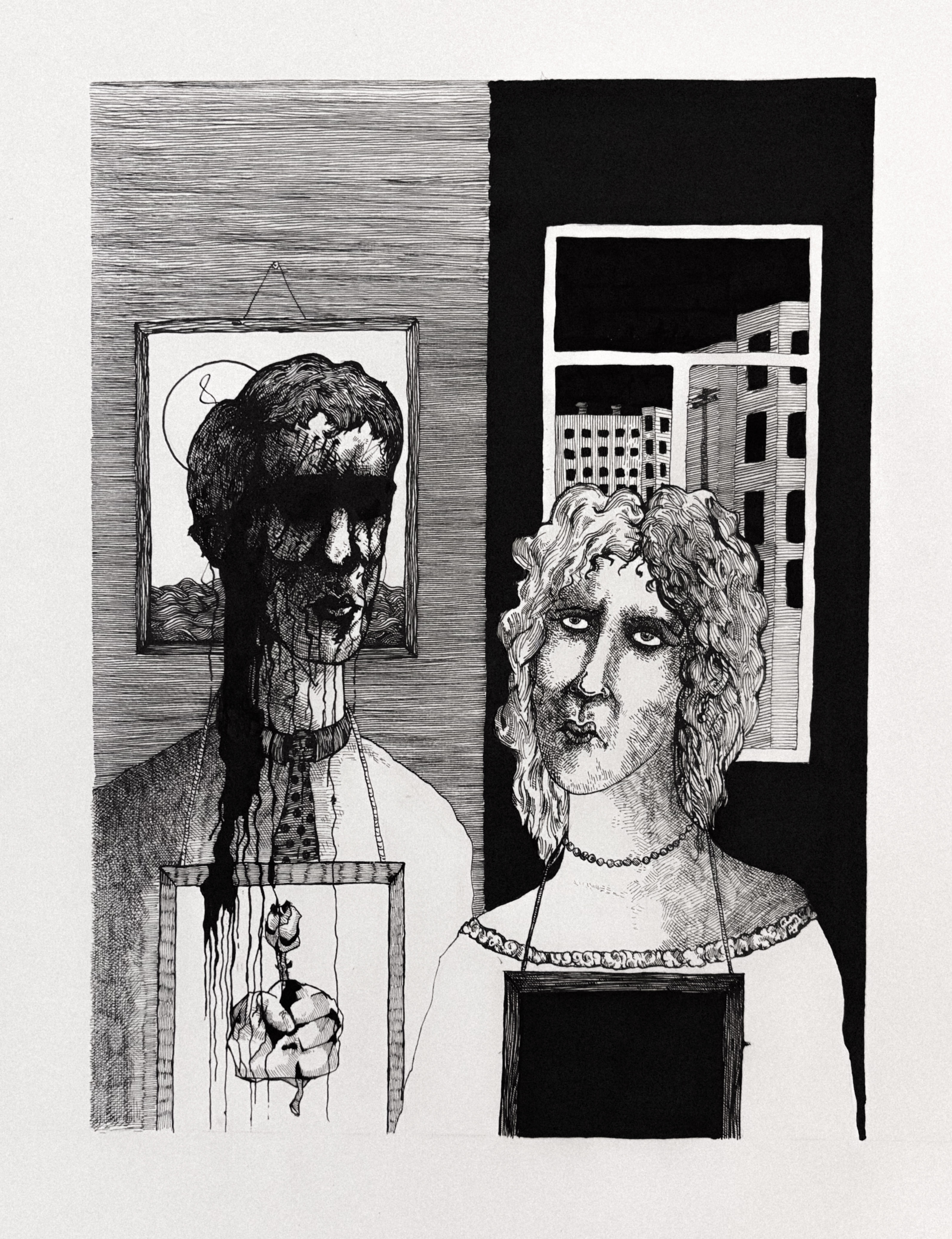 A través de la tinta, su obra habita el límite entre lo figurativo y lo onírico, construyendo escenas que condensan una sensación de aislamiento y fragilidad. Sus rostros fragmentados, cuerpos suspendidos en paisajes inciertos y la densidad de sus trazos revelan una sensibilidad que atraviesa lo humano y lo espectral.