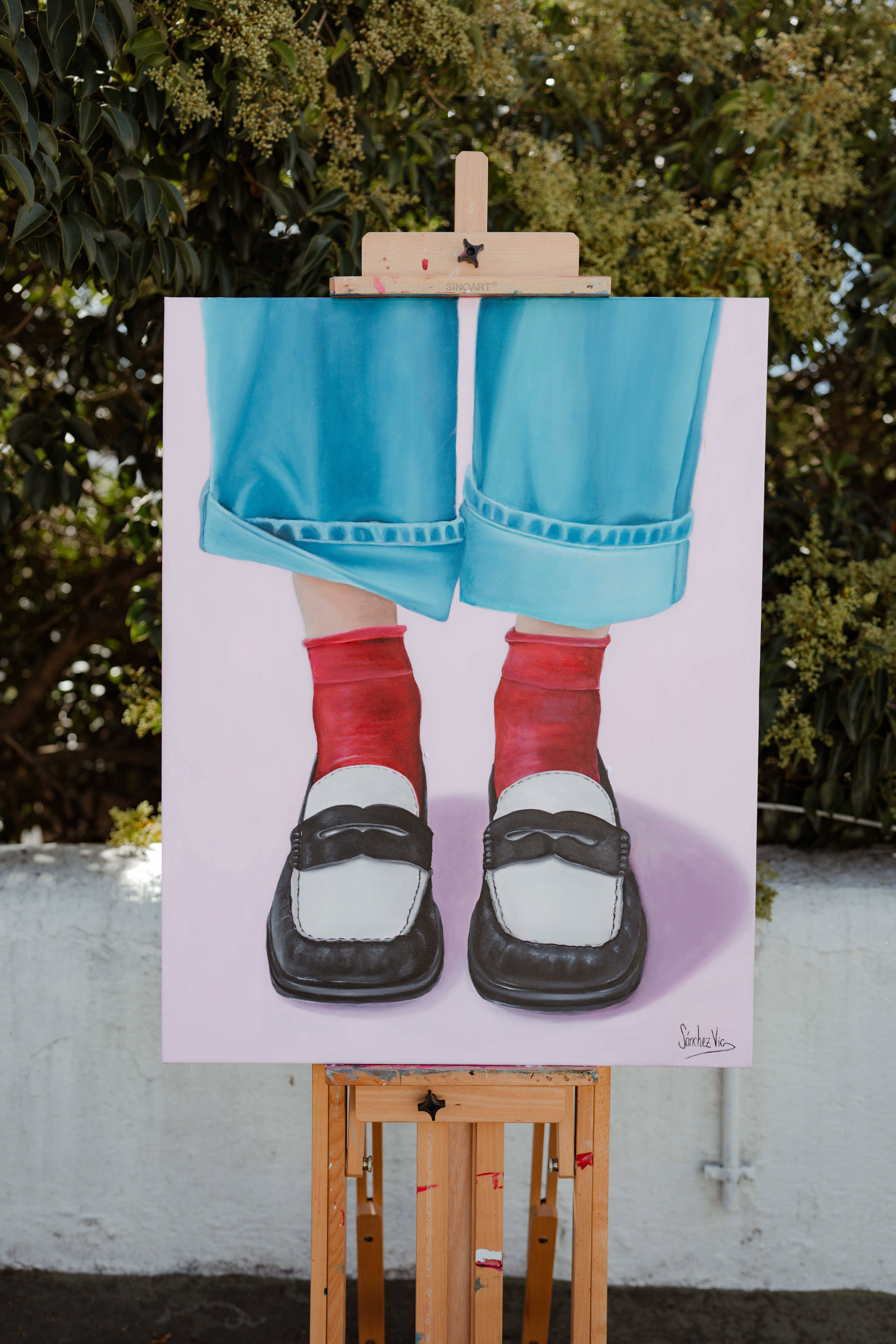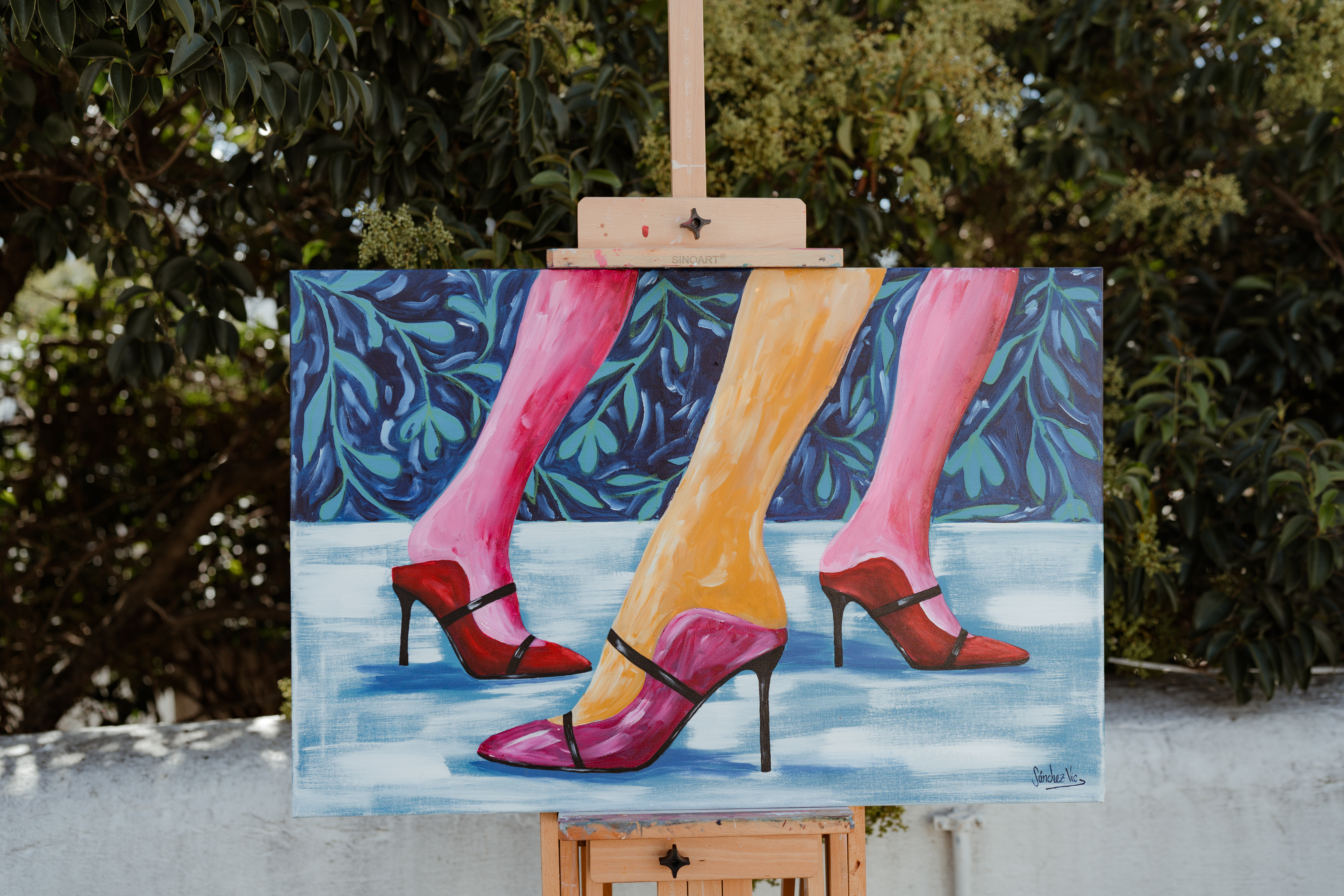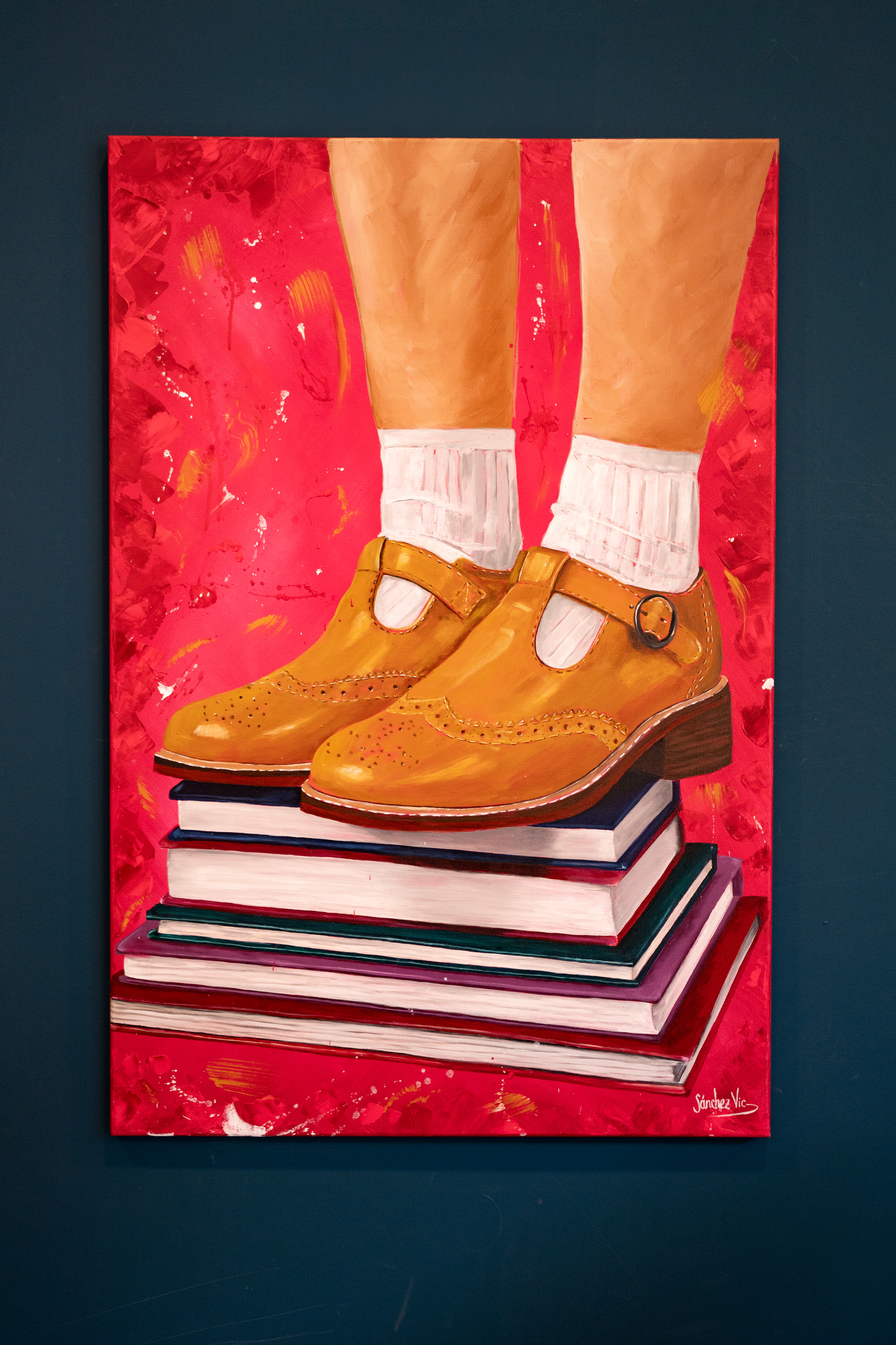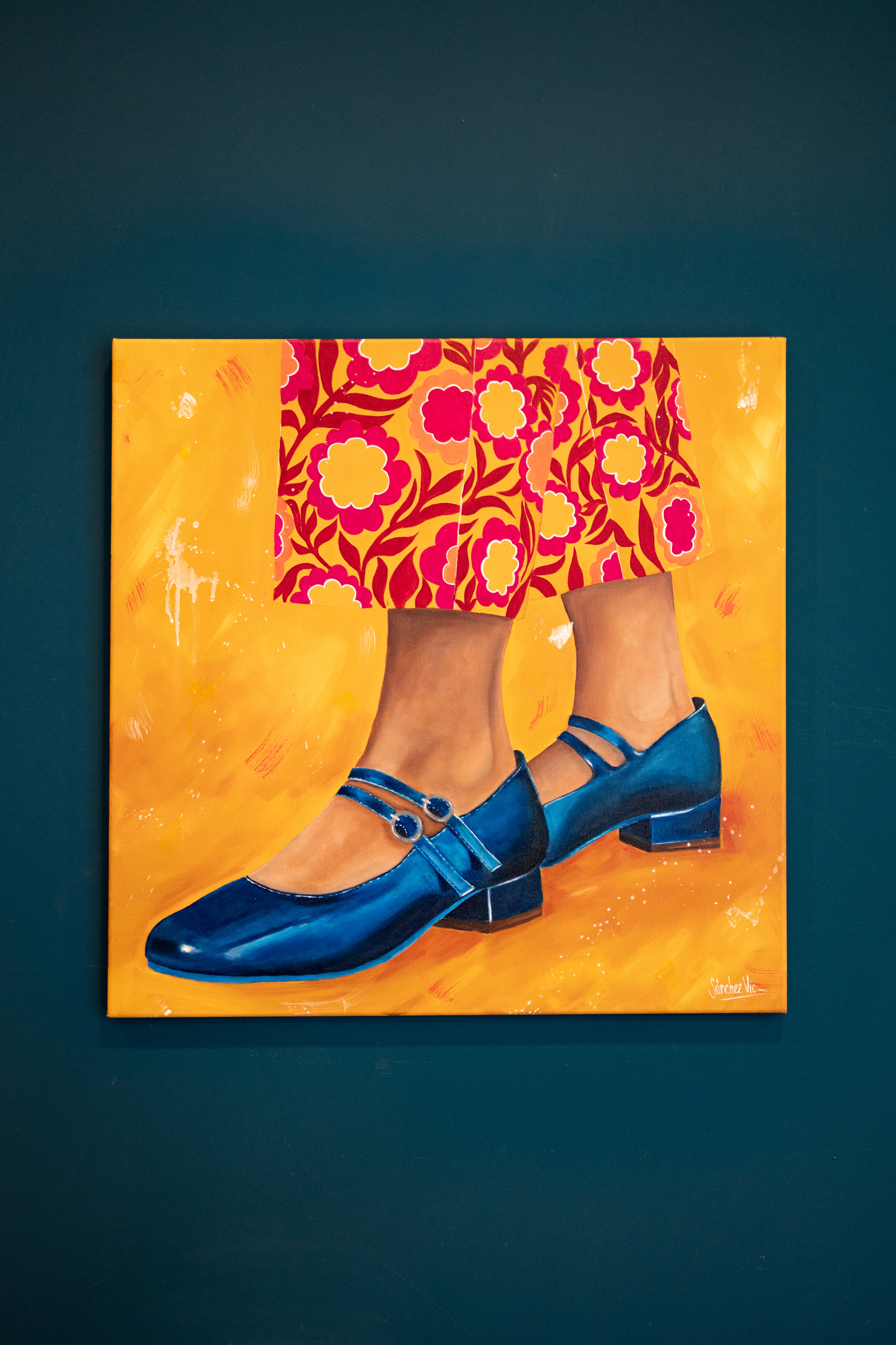 Cada una de sus piezas es una historia en movimiento, un gesto de empoderamiento hecho pincel. En su serie Pasos de Poder, los pies calzados en mundos imaginarios se transforman en símbolos de valentía, identidad y transformación.